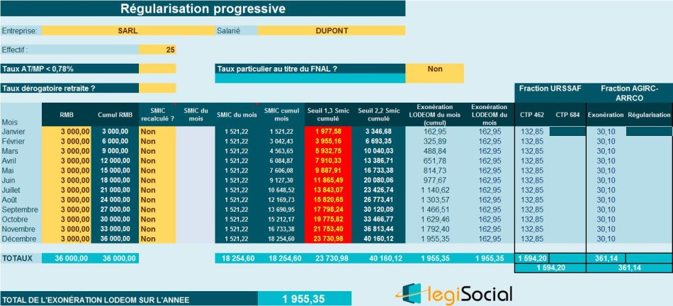 Compte tenu du contexte, le coefficient est donc de 1,3 × (0,3254 / 0,9) × (2,2 × 18.254,60 €/36.000 €)- 1), soit 0,054315 permettant de déclencher une exonération LODEOM de 0,054315 * 36.000 €= 1.955,35 €