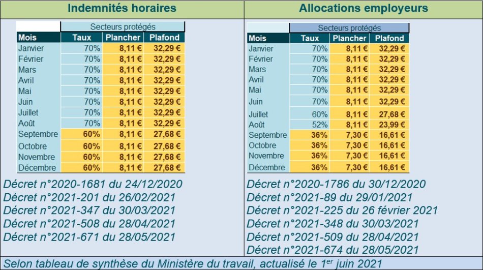En l’état des textes publiés actuellement au JO, voici le régime des indemnités horaires versées aux salariés et des allocations attribués aux employeurs des secteurs protégés sur l’année 2021 :
