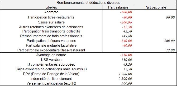Désormais, dans la partie « Remboursements et déductions diverses » devront apparaître les éléments suivants (de 1 à 8) :