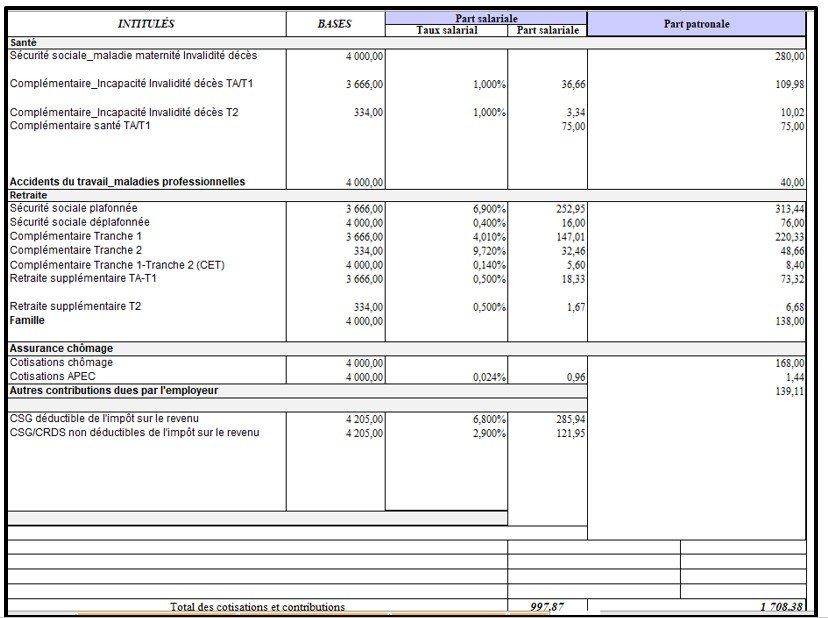 - Un total de cotisations salariales de 997,87 € (réparties en 2 zones : une zone dite « Cotisations et contributions sociales obligatoires », où ne figurent pas les cotisations salariales de prévoyance complémentaire et de retraite supplémentaire, et une zone dite « Cotisations et contributions sociales facultatives » où ne figurent présentement que les cotisations salariales de prévoyance et de retraire supplémentaire) ;