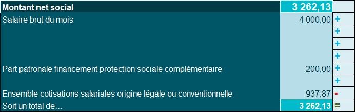 - Moins la part salariale prévoyance complémentaire (36,66 €+3,34 €= 40,00 €)