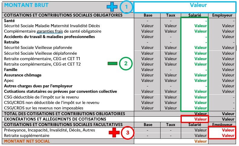 De façon plus détaillée et précise, le montant net social est déterminé comme suit (les informations que nous proposons ici ont été confirmées par le document « questions/réponses » du site du Ministère du travail) :