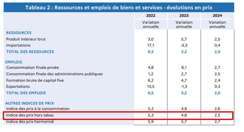 Ainsi qu’indiqué en préambule, voici l’extrait du rapport économique et financier (annexe PLF pour 2024), que nous avons utilisé comme base de nos calculs et de notre évaluation du barème de l’avantage en nature logement pour 2024.