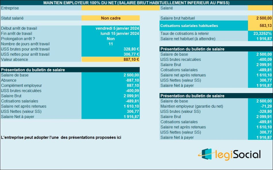 - L’entreprise rédige le bulletin de paie en indiquant la valeur de l’absence, puis le maintien intégral de cette absence et ensuite le traitement des IJSS recalculées.