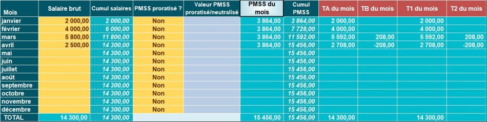 - En avril 2024 : le total des salaires est inférieur au cumul des PMSS, les cotisations sont calculées uniquement sur la TA (et T1), aucune cotisation ne se calcule sur la TB ou T2 ;