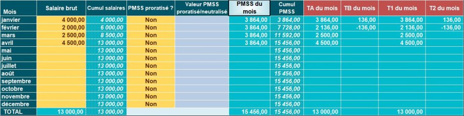 - En janvier 2024 : le total des salaires est supérieur au cumul des PMSS, les cotisations sont calculées sur la TA (et T1) avec une assiette de 3.864 € (soit le PMSS), des cotisations se calculent sur la TB ou T2 à hauteur de 136 € (4.000 € (salaire brut) moins base TA (3.864 €) ;
