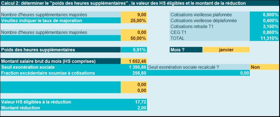 - La réduction au titre des heures supplémentaires ou complémentaires ne s’applique que sur la part de la rémunération supérieure à ce plafond, à proportion de la part de la rémunération due au titre de ces heures supplémentaires dans le total de la rémunération.