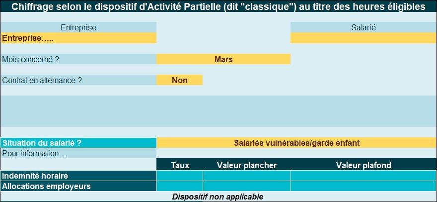 - Notre outil vous confirme par un message, et l’absence de valeurs (taux, valeurs planchers et plafonds) que ce dispositif ne s’applique pas au titre des périodes d’emploi de mars 2021.