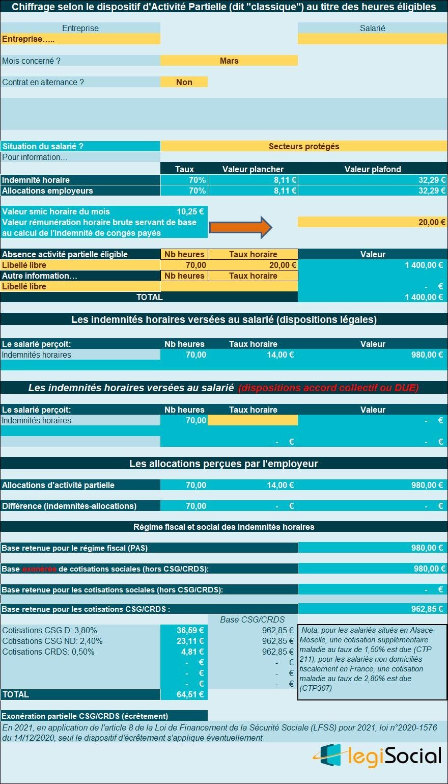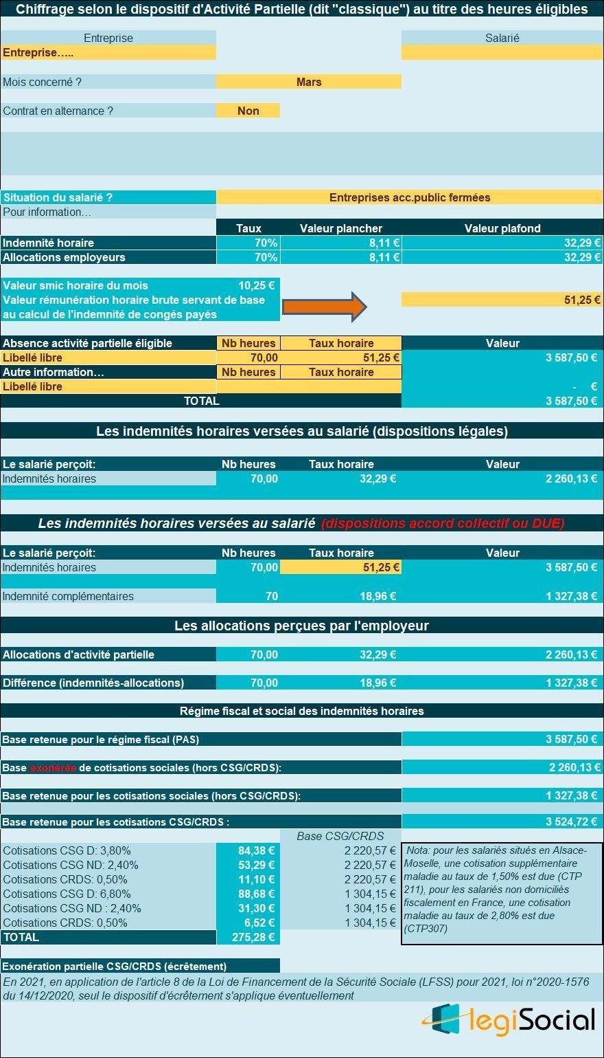 - Le salarié est placé en activité partielle durant 2 semaines, soit 70 heures, en mars 2021.