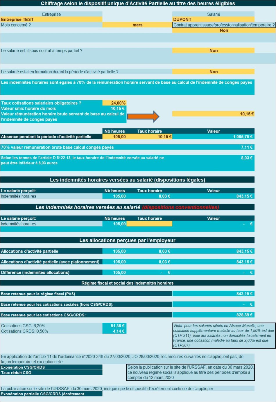 - L’employeur recevra de l’Etat / Unedic une allocation de : 21,31 x 20 = 426,30 € ;