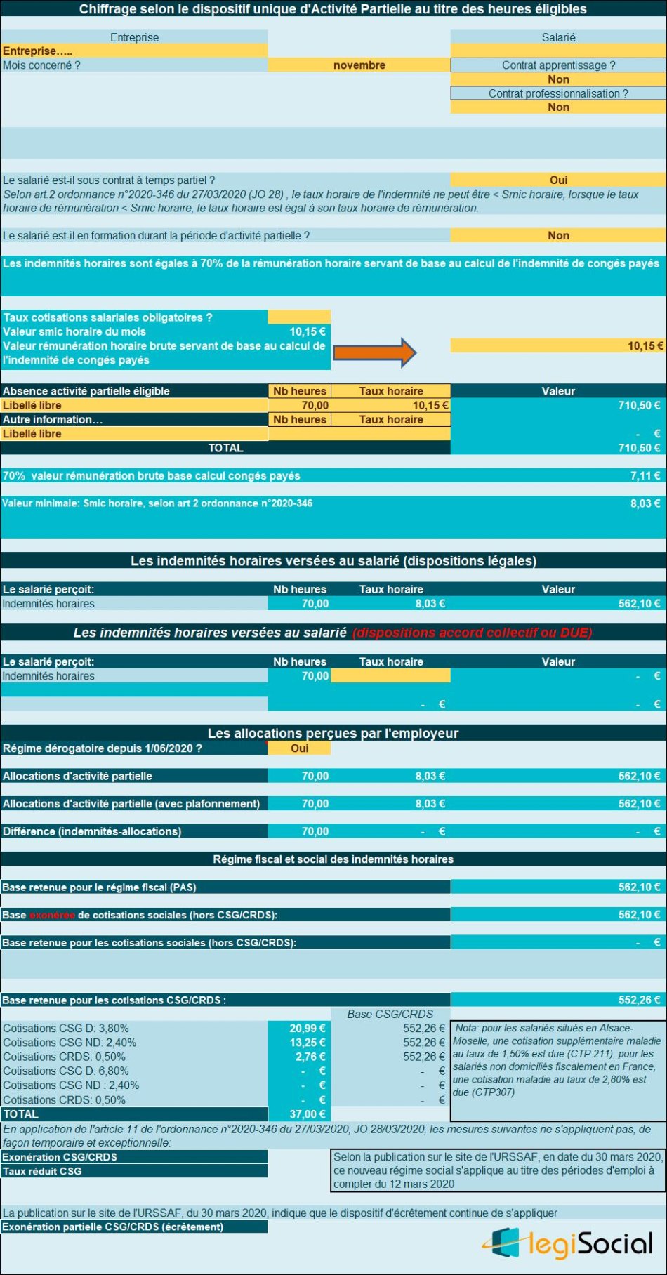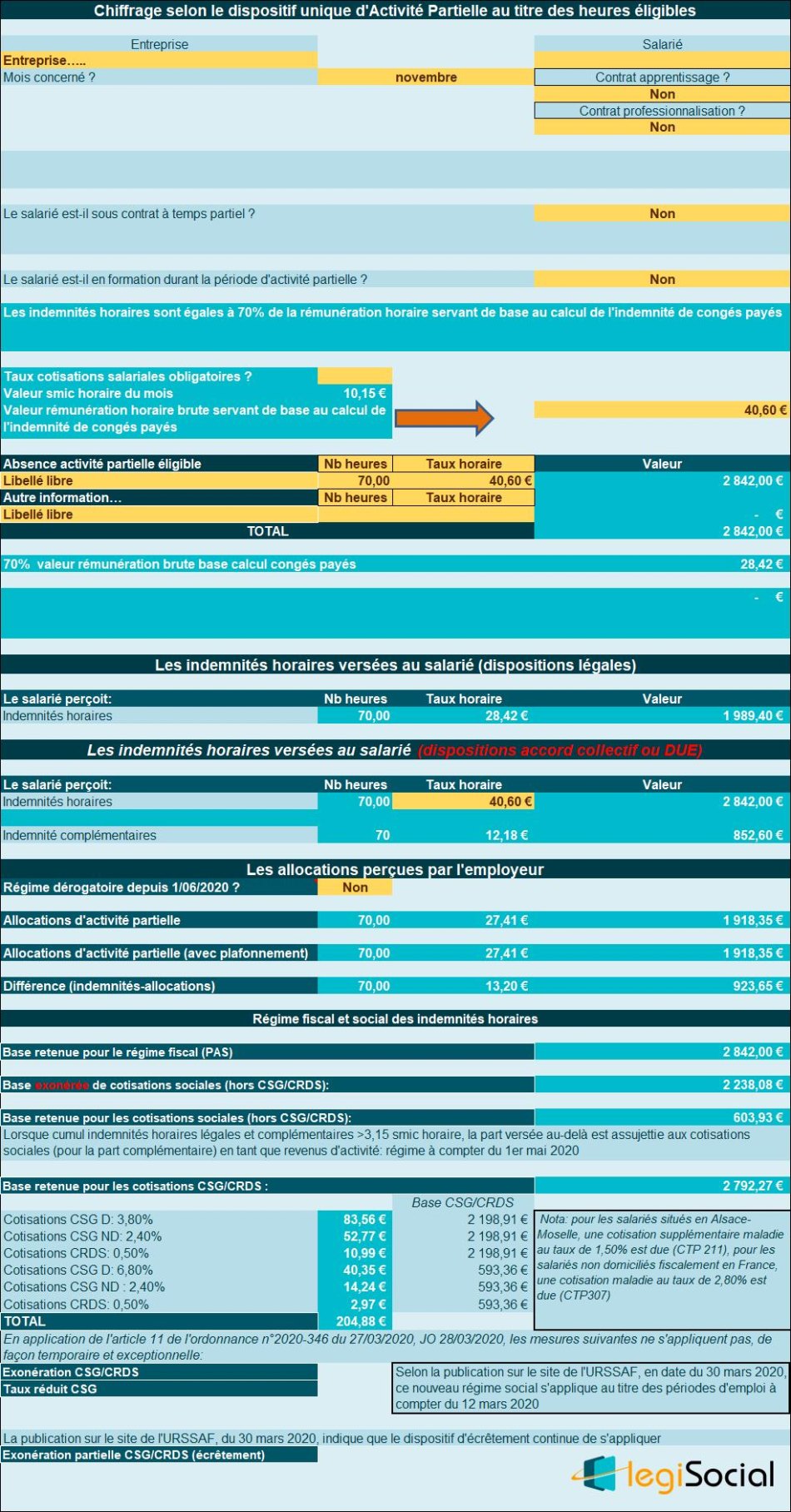 - Le salarié est placé en activité partielle durant 2 semaines, soit 70 heures, en novembre 2020 ;