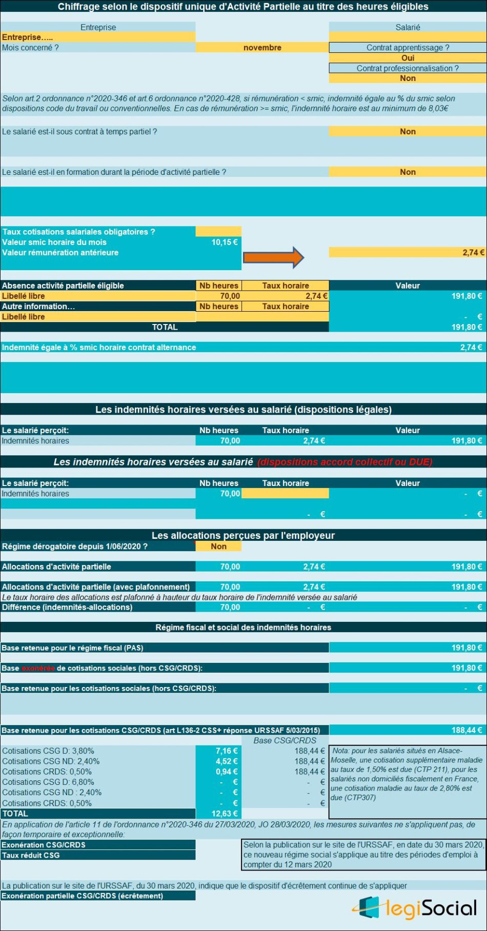 - Le salarié est placé en activité partielle durant 2 semaines, soit 70 heures, en novembre 2020, et en formation également;