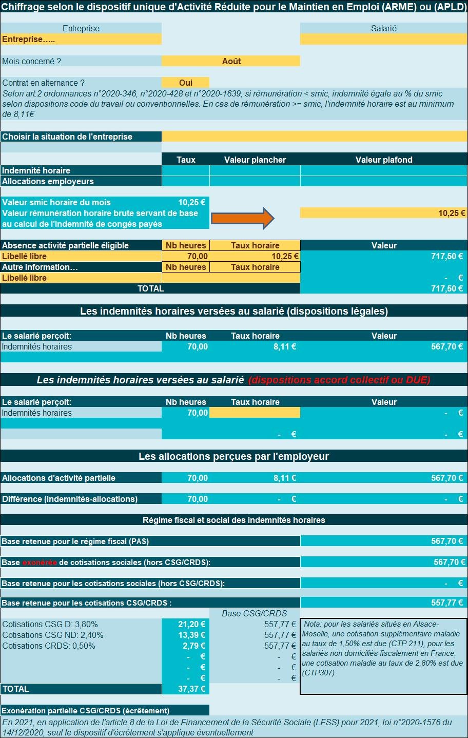 - Le salarié est placé en APLD durant 2 semaines, soit 70 heures, en août 2021.