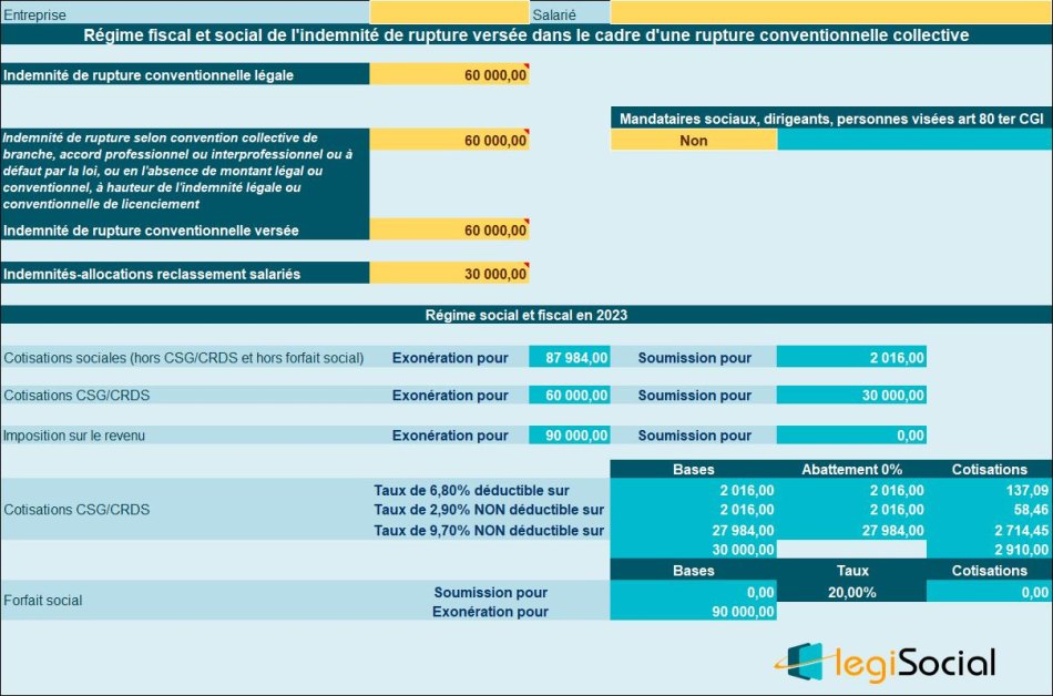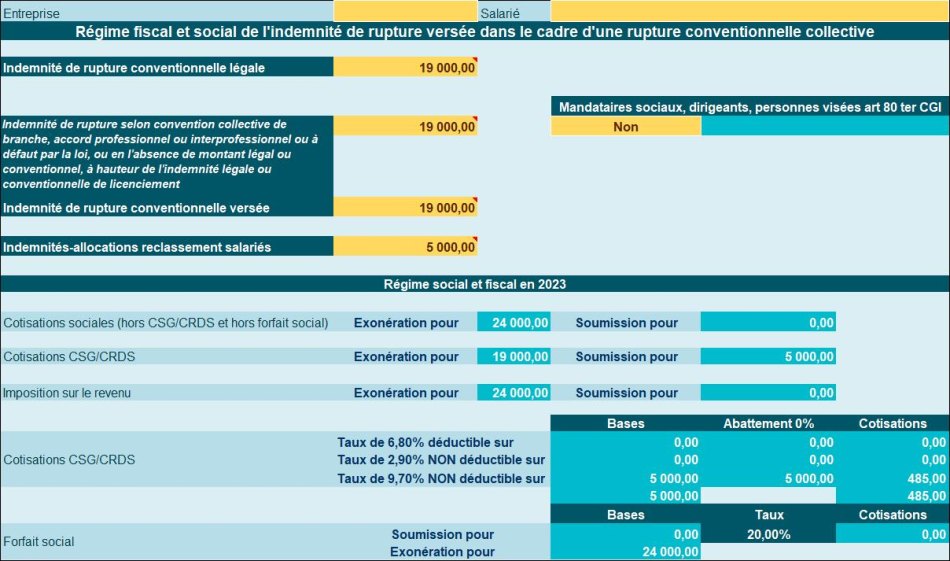 - Il est fait masse des indemnités versées dans le cadre de la convention de rupture collective et la part non imposable est comparée avec le seuil d’exclusion de l’assiette des cotisations : 24 000 € < 82 272 €.