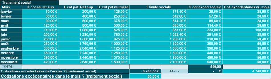 Il en ressort que des cotisations excédentaires de retraite supplémentaire sont à constater, traitement social, à hauteur de 2.640 € moins 2.100,00 €, soit 540,00 €