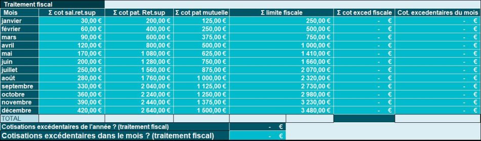 Le seuil d’exonération fiscale, déterminée précédemment étant de 3.480,00 €, aucune cotisation excédentaire n’est constatée au niveau du traitement fiscal.