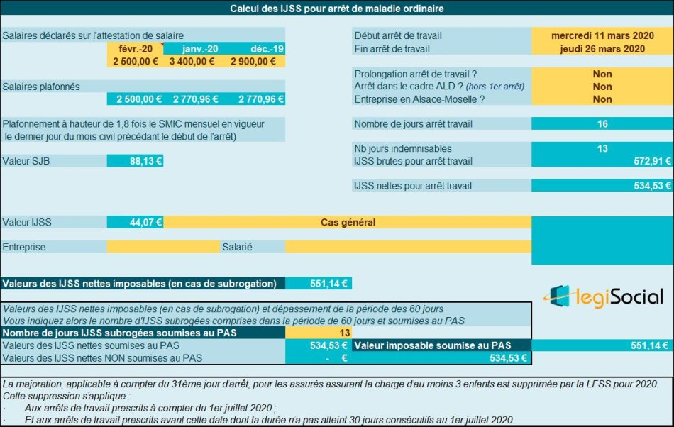 Nous obtenons donc le résultat suivant (capture d’écran de notre outil de traitement de la maladie en paie):