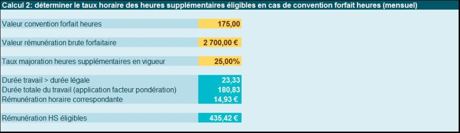 Sont éligibles les heures supplémentaires effectuées dans le cadre d’une convention de forfait en heures (qu’il s’agisse des heures incluses dans le forfait ou des heures effectuées au-delà).