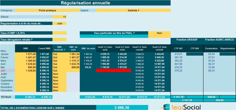 - En régularisation progressive, le cumul des salaires versés de janvier à juin 2019 inclus, continue à être inférieur à 1,3 Smic, même avec un Smic à 0 € au mois de juin 2019, l’entreprise bénéficie donc de l’exonération LODEOM sur l’intégralité des salaires versés soit un montant de 8.296,14 € * 0,3214= 2.666,38 €.