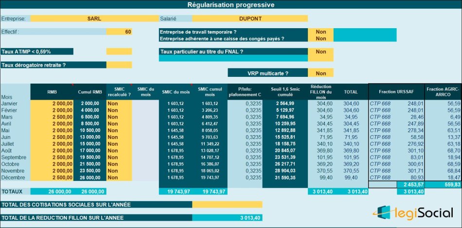 Si l’entreprise détermine la réduction Fillon selon la méthode de régularisation annuelle, nous obtenons le tableau de suivi ci-après :