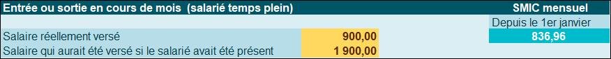 - Un salarié arrive (ou part) en cours de mois et perçoit un salaire brut de 900 € ;