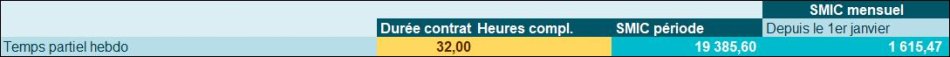 - [Smic mensuel temps plein *(durée contrat hebdo/ durée légale)] + (nombre HC*Smic horaire)