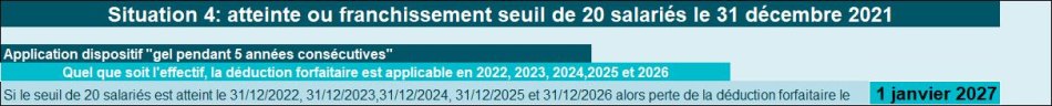 - Concrètement, cette atteinte ou franchissement du seuil de 20 salariés doit être constatée au 31 décembre 2022, 31 décembre 2023, 31 décembre 2024, 31 décembre 2025 et 31 décembre 2026 conduisant à une perte du bénéfice de la déduction forfaitaire TEPA à compter du 1er janvier 2028.