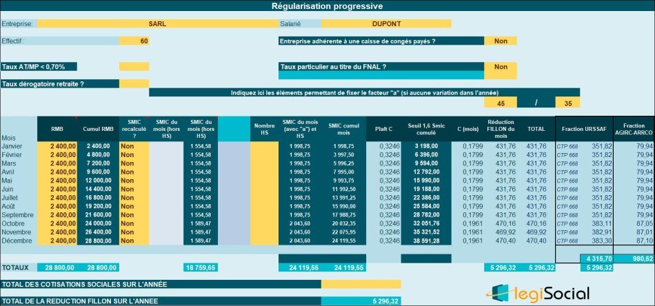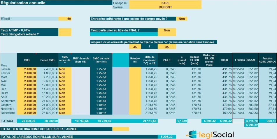 | Détermination de la réduction Fillon sur l’année | C= (T/0,6) × [(1,6 × a × SMIC calculé pour un an/ RAB-) 1] × b. Soit dans le cas présent : C= (0,3246/0,6) × [(1,6 × (45/35) × 18.759,65 €/ 28.800 €) - 1] × 1 = 0,1839 ce qui donne une réduction FILLON de 0,1839* 28.800 €= 5.296,32 € |