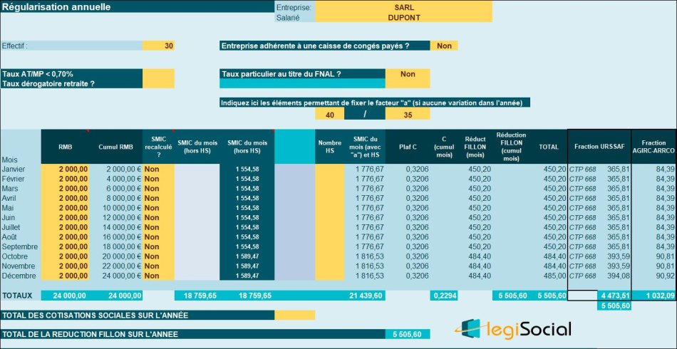Détermination de la réduction Fillon sur l’année | C= (T/0,6) × [(1,6 × a × SMIC calculé pour un an/ RAB-) 1] × b. Soit dans le cas présent : C= (0,3206/0,6) × [(1,6 × (40/35) × 18.759,65 €/ 24.000 €) - 1] × 1 = 0,2294 ce qui donne une réduction FILLON de 0,2294 * 24.000 €= 5.505,60 € |
