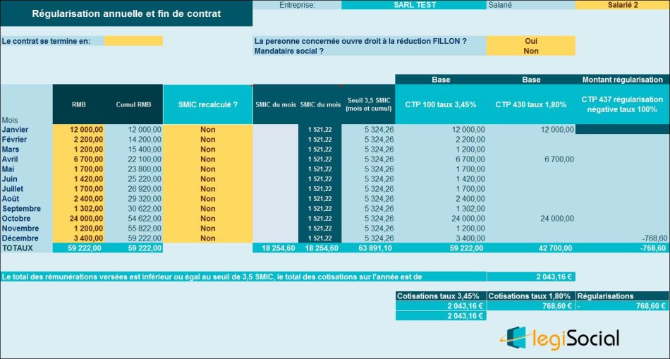 Sur l’année 2019, la rémunération brute est inférieure au seuil de 3,5 Smic, aucune cotisation majorée ne doit être appliquée sur l’année, une régularisation est donc réalisée en décembre 2019.